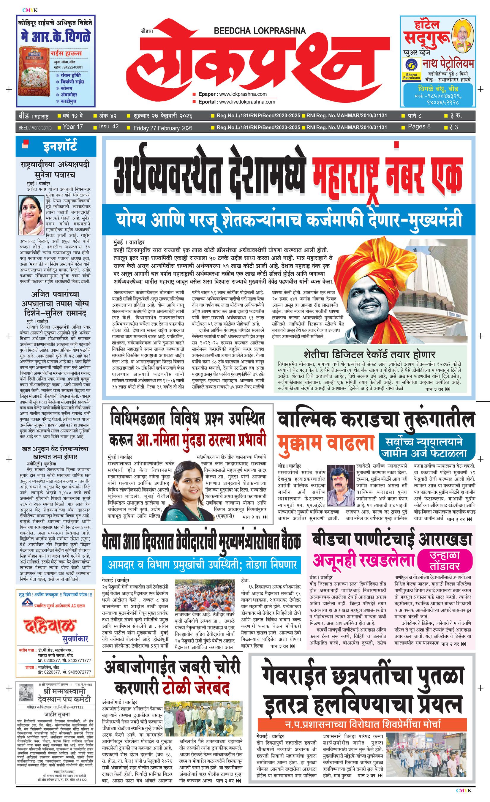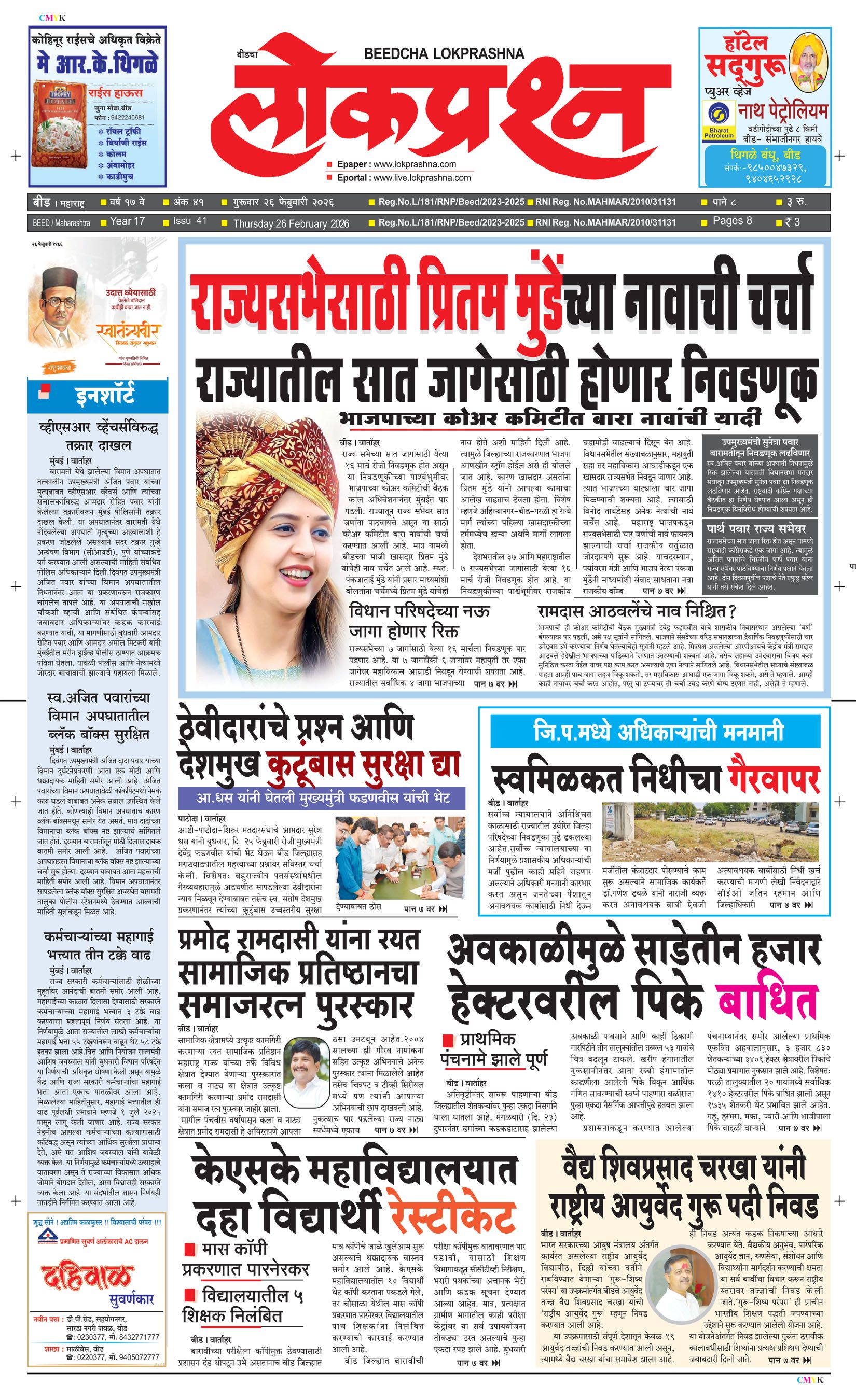 संपादक – दिलीप मधुकर खिस्ती, मो नं 9422242790, जाहिरात विभाग – 9595353531, dainiklokprashna@gmail.com, beedlokprashna@gmail.com, दै. बीडचा लोकप्रश्न, स्टेडियम कॉम्प्लेक्स सहयोगनगर, बीड जि. बीड – ४३११२२ पहिले पान दुसरे पान तिसरे पान चौथे पान पाचवे पान सहावे पान सातवे पान आठवे पान Visitor Counter free online counter Thursday, 26 February 2026