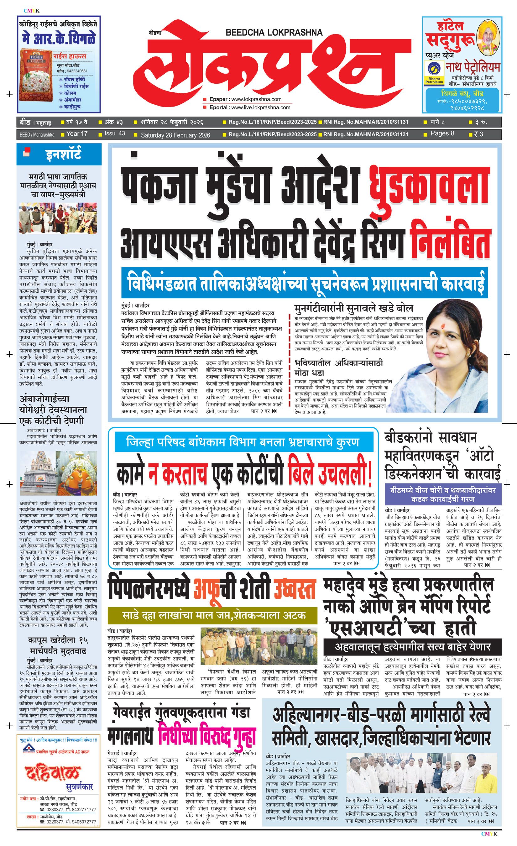 संपादक – दिलीप मधुकर खिस्ती, मो नं 9422242790, जाहिरात विभाग – 9595353531, dainiklokprashna@gmail.com, beedlokprashna@gmail.com, दै. बीडचा लोकप्रश्न, स्टेडियम कॉम्प्लेक्स सहयोगनगर, बीड जि. बीड – ४३११२२ पहिले पान दुसरे पान तिसरे पान चौथे पान पाचवे पान सहावे पान सातवे पान आठवे पान Visitor Counter free online counter Saturday, 28 February 2026