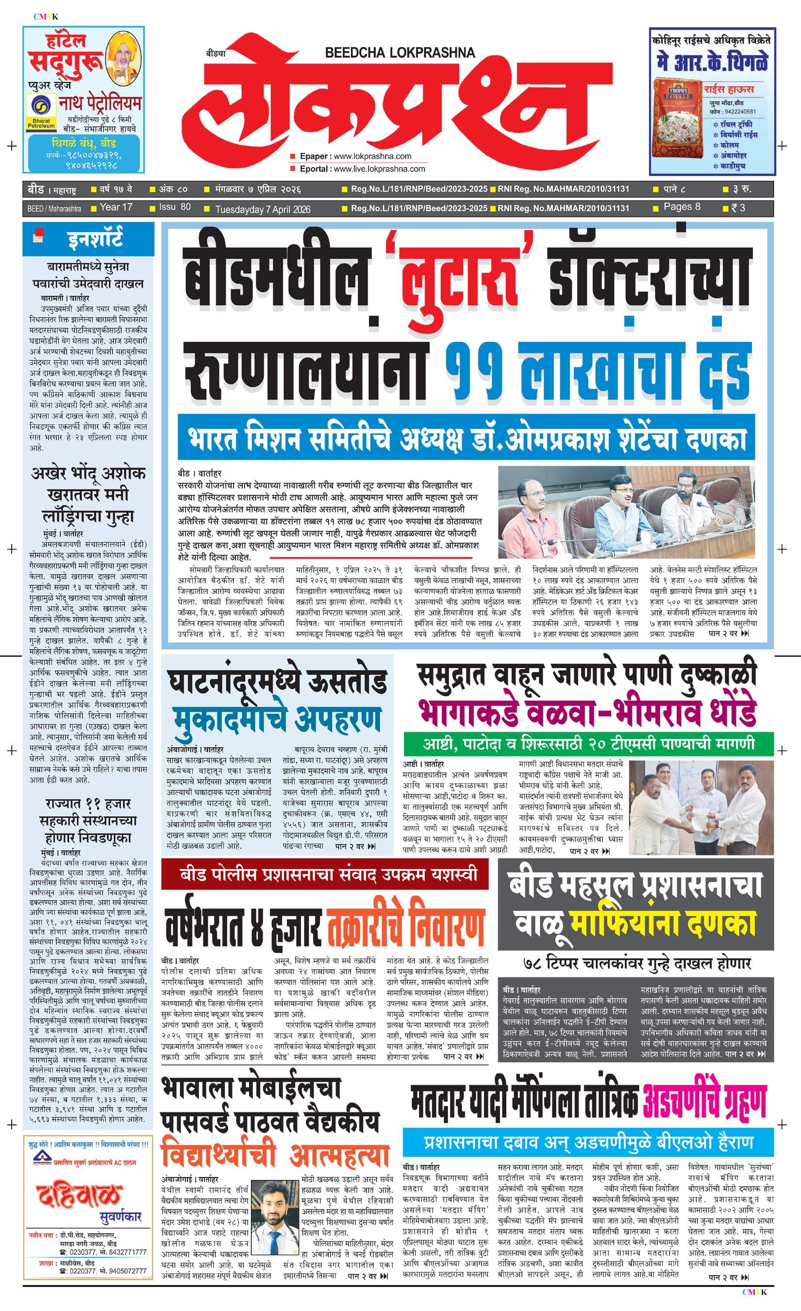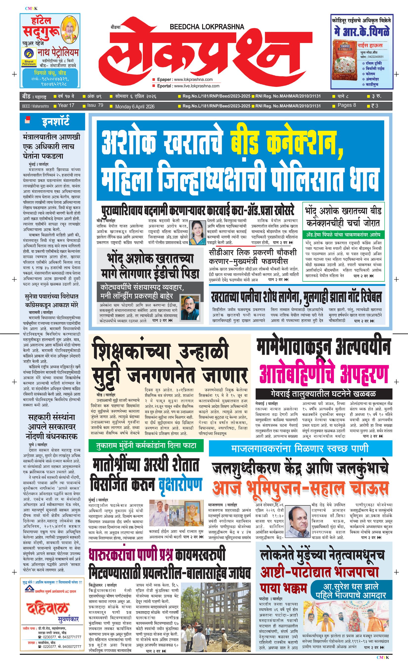 संपादक – दिलीप मधुकर खिस्ती, मो नं 9422242790, जाहिरात विभाग – 9595353531, dainiklokprashna@gmail.com, beedlokprashna@gmail.com, दै. बीडचा लोकप्रश्न, स्टेडियम कॉम्प्लेक्स सहयोगनगर, बीड जि. बीड – ४३११२२ पहिले पान दुसरे पान तिसरे पान चौथे पान पाचवे पान सहावे पान सातवे पान आठवे पान Visitor Counter free online counter Monday, 6 April 2026