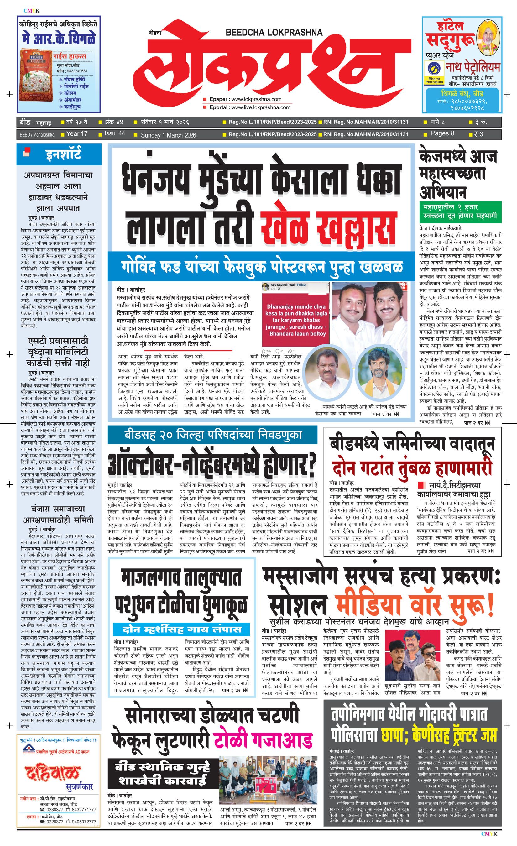 संपादक – दिलीप मधुकर खिस्ती, मो नं 9422242790, जाहिरात विभाग – 9595353531, dainiklokprashna@gmail.com, beedlokprashna@gmail.com, दै. बीडचा लोकप्रश्न, स्टेडियम कॉम्प्लेक्स सहयोगनगर, बीड जि. बीड – ४३११२२ पहिले पान दुसरे पान तिसरे पान चौथे पान पाचवे पान सहावे पान सातवे पान आठवे पान Visitor Counter free online counter Sunday, 1 March 2026