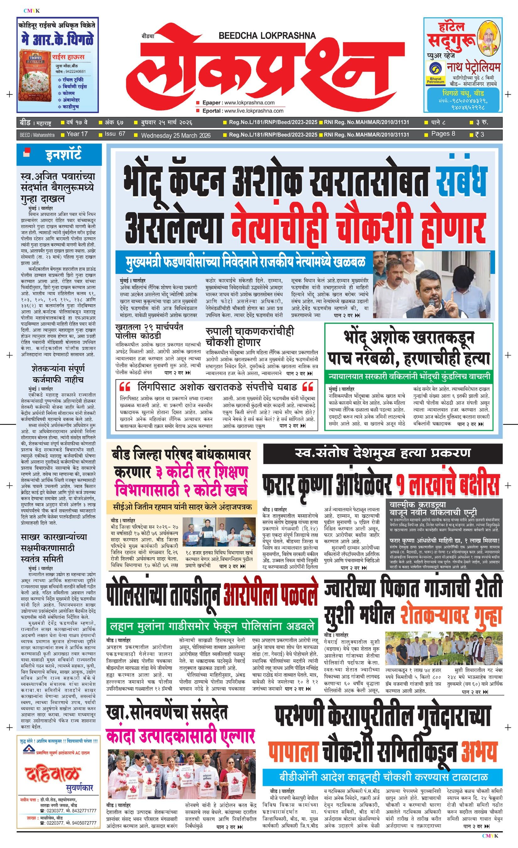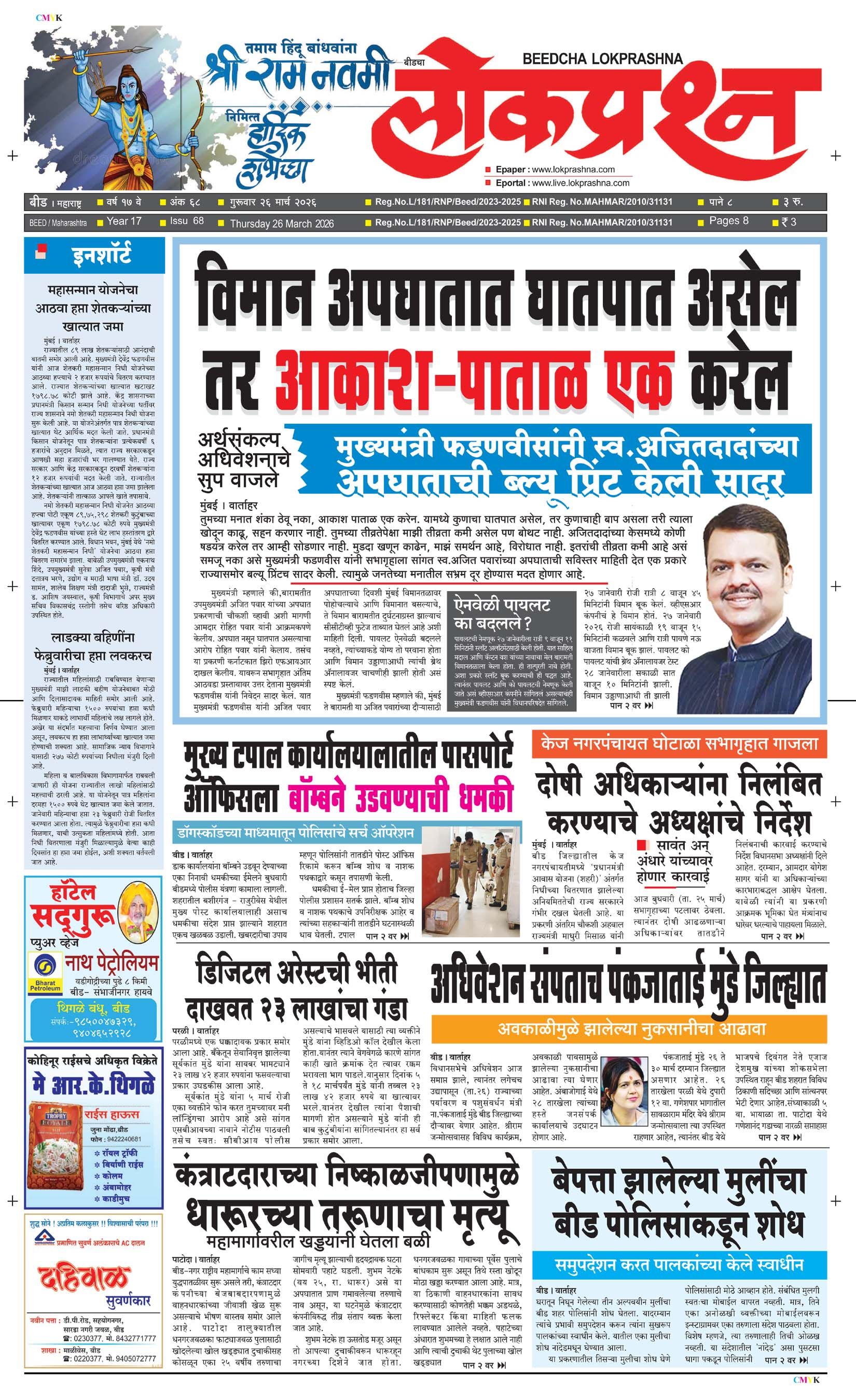 संपादक – दिलीप मधुकर खिस्ती, मो नं 9422242790, जाहिरात विभाग – 9595353531, dainiklokprashna@gmail.com, beedlokprashna@gmail.com, दै. बीडचा लोकप्रश्न, स्टेडियम कॉम्प्लेक्स सहयोगनगर, बीड जि. बीड – ४३११२२ पहिले पान दुसरे पान तिसरे पान चौथे पान पाचवे पान सहावे पान सातवे पान आठवे पान Visitor Counter free online counter Thursday, 26 March 2026