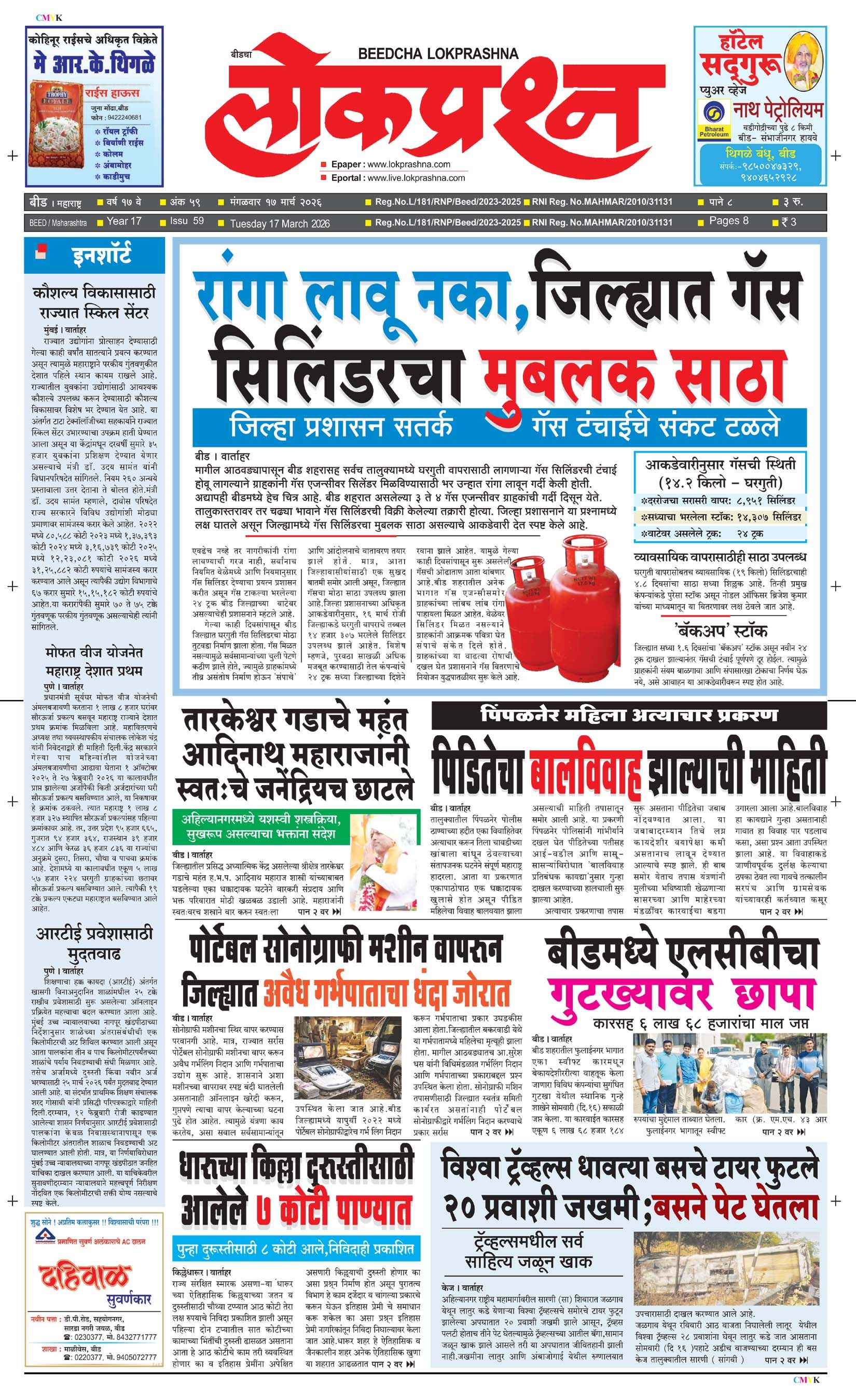 संपादक – दिलीप मधुकर खिस्ती, मो नं 9422242790, जाहिरात विभाग – 9595353531, dainiklokprashna@gmail.com, beedlokprashna@gmail.com, दै. बीडचा लोकप्रश्न, स्टेडियम कॉम्प्लेक्स सहयोगनगर, बीड जि. बीड – ४३११२२ पहिले पान दुसरे पान तिसरे पान चौथे पान पाचवे पान सहावे पान सातवे पान आठवे पान Visitor Counter free online counter Tuesday, 17 March 2026