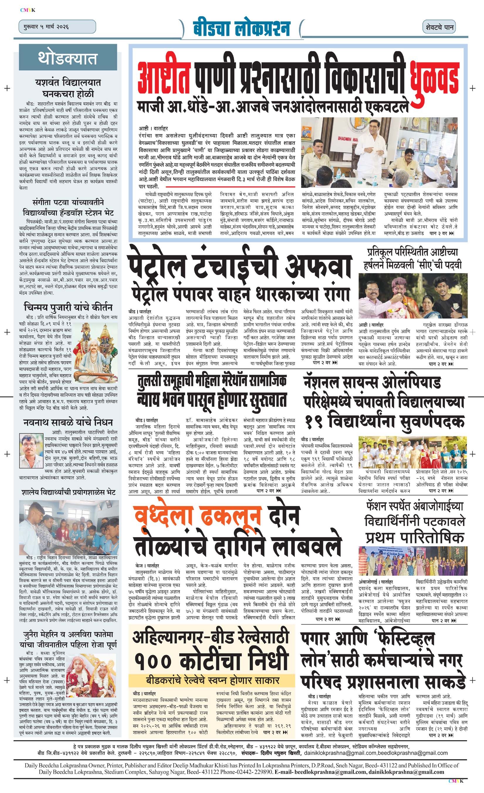 संपादक – दिलीप मधुकर खिस्ती, मो नं 9422242790, जाहिरात विभाग – 9595353531, dainiklokprashna@gmail.com, beedlokprashna@gmail.com, दै. बीडचा लोकप्रश्न, स्टेडियम कॉम्प्लेक्स सहयोगनगर, बीड जि. बीड – ४३११२२ << First << 1 >> Last >> पहिले पान दुसरे पान तिसरे पान चौथे पान पाचवे पान सहावे पान सातवे पान आठवे पान Visitor Counter free online counter