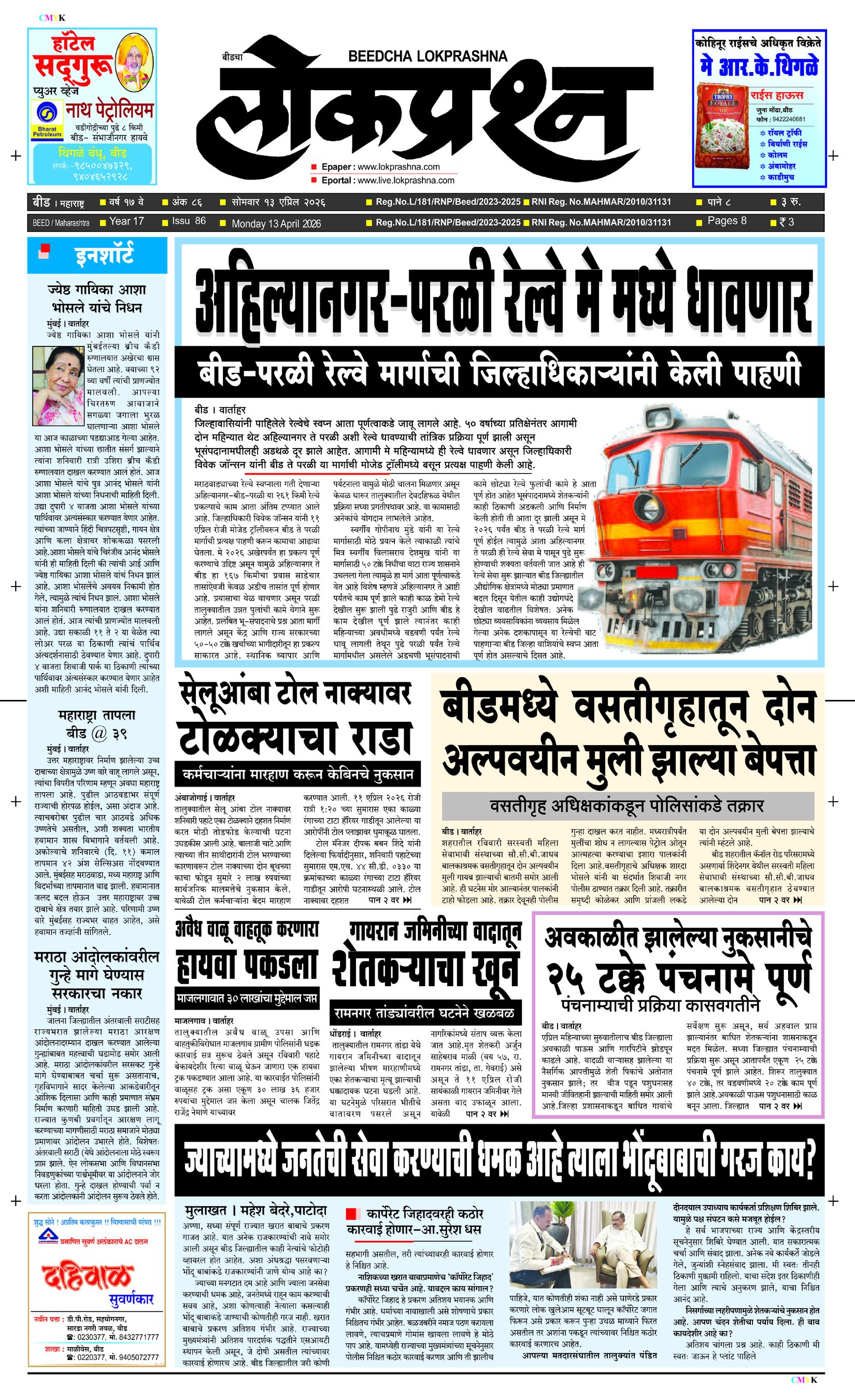 संपादक – दिलीप मधुकर खिस्ती, मो नं 9422242790, जाहिरात विभाग – 9595353531, dainiklokprashna@gmail.com, beedlokprashna@gmail.com, दै. बीडचा लोकप्रश्न, स्टेडियम कॉम्प्लेक्स सहयोगनगर, बीड जि. बीड – ४३११२२ पहिले पान दुसरे पान तिसरे पान चौथे पान पाचवे पान सहावे पान सातवे पान आठवे पान Visitor Counter free online counter Monday, 13 April 2026