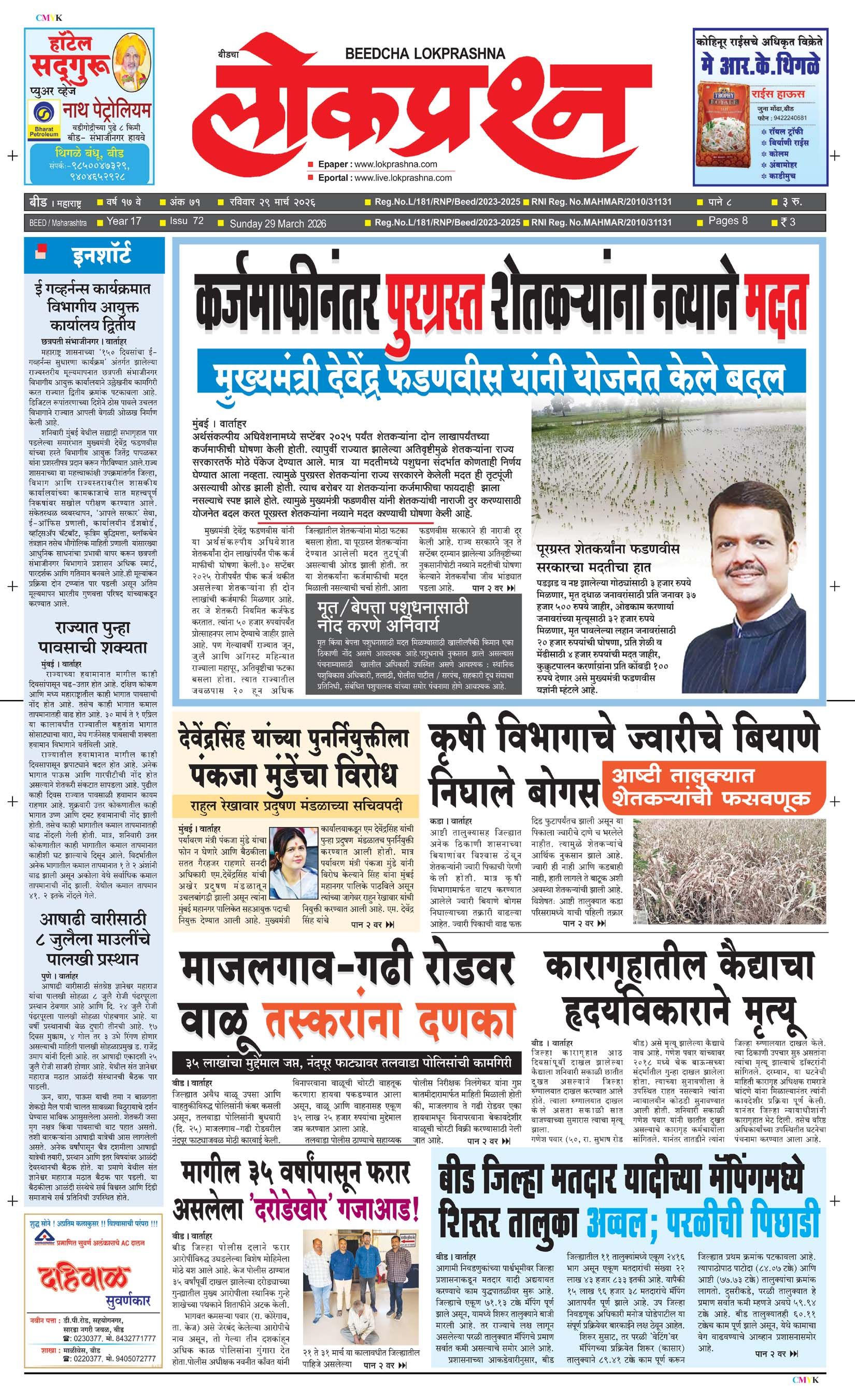 संपादक – दिलीप मधुकर खिस्ती, मो नं 9422242790, जाहिरात विभाग – 9595353531, dainiklokprashna@gmail.com, beedlokprashna@gmail.com, दै. बीडचा लोकप्रश्न, स्टेडियम कॉम्प्लेक्स सहयोगनगर, बीड जि. बीड – ४३११२२ पहिले पान दुसरे पान तिसरे पान चौथे पान पाचवे पान सहावे पान सातवे पान आठवे पान Visitor Counter free online counter Sunday, 29 March 2026