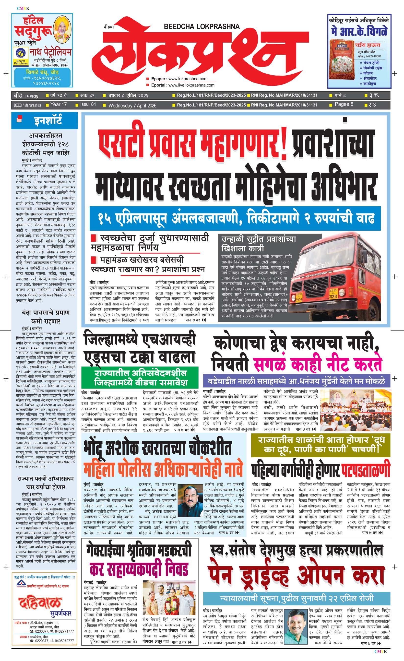 संपादक – दिलीप मधुकर खिस्ती, मो नं 9422242790, जाहिरात विभाग – 9595353531, dainiklokprashna@gmail.com, beedlokprashna@gmail.com, दै. बीडचा लोकप्रश्न, स्टेडियम कॉम्प्लेक्स सहयोगनगर, बीड जि. बीड – ४३११२२ पहिले पान दुसरे पान तिसरे पान चौथे पान पाचवे पान सहावे पान सातवे पान आठवे पान Visitor Counter free online counter Wednesday, 8 April 2026