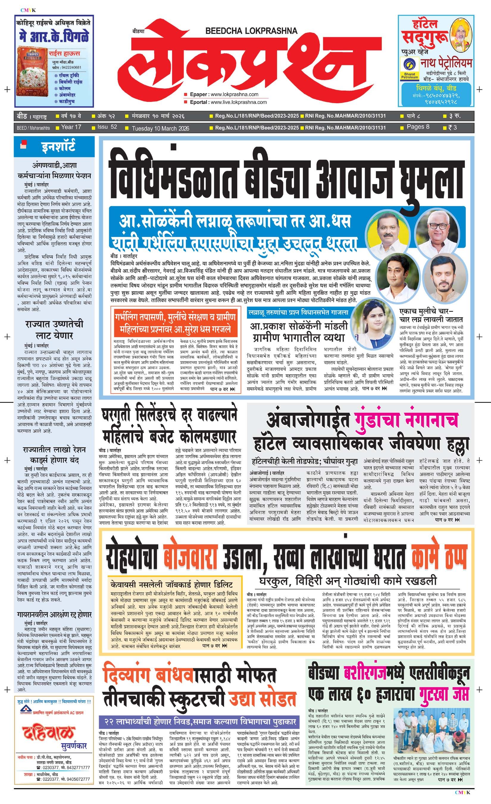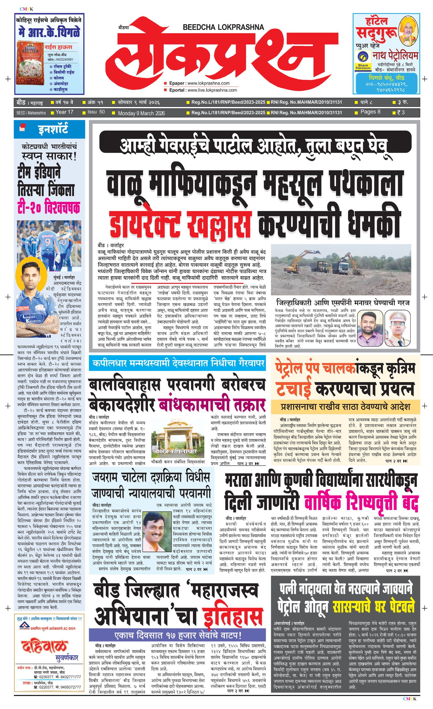 संपादक – दिलीप मधुकर खिस्ती, मो नं 9422242790, जाहिरात विभाग – 9595353531, dainiklokprashna@gmail.com, beedlokprashna@gmail.com, दै. बीडचा लोकप्रश्न, स्टेडियम कॉम्प्लेक्स सहयोगनगर, बीड जि. बीड – ४३११२२ पहिले पान दुसरे पान तिसरे पान चौथे पान पाचवे पान सहावे पान सातवे पान आठवे पान Visitor Counter free online counter Monday, 9 March 2026