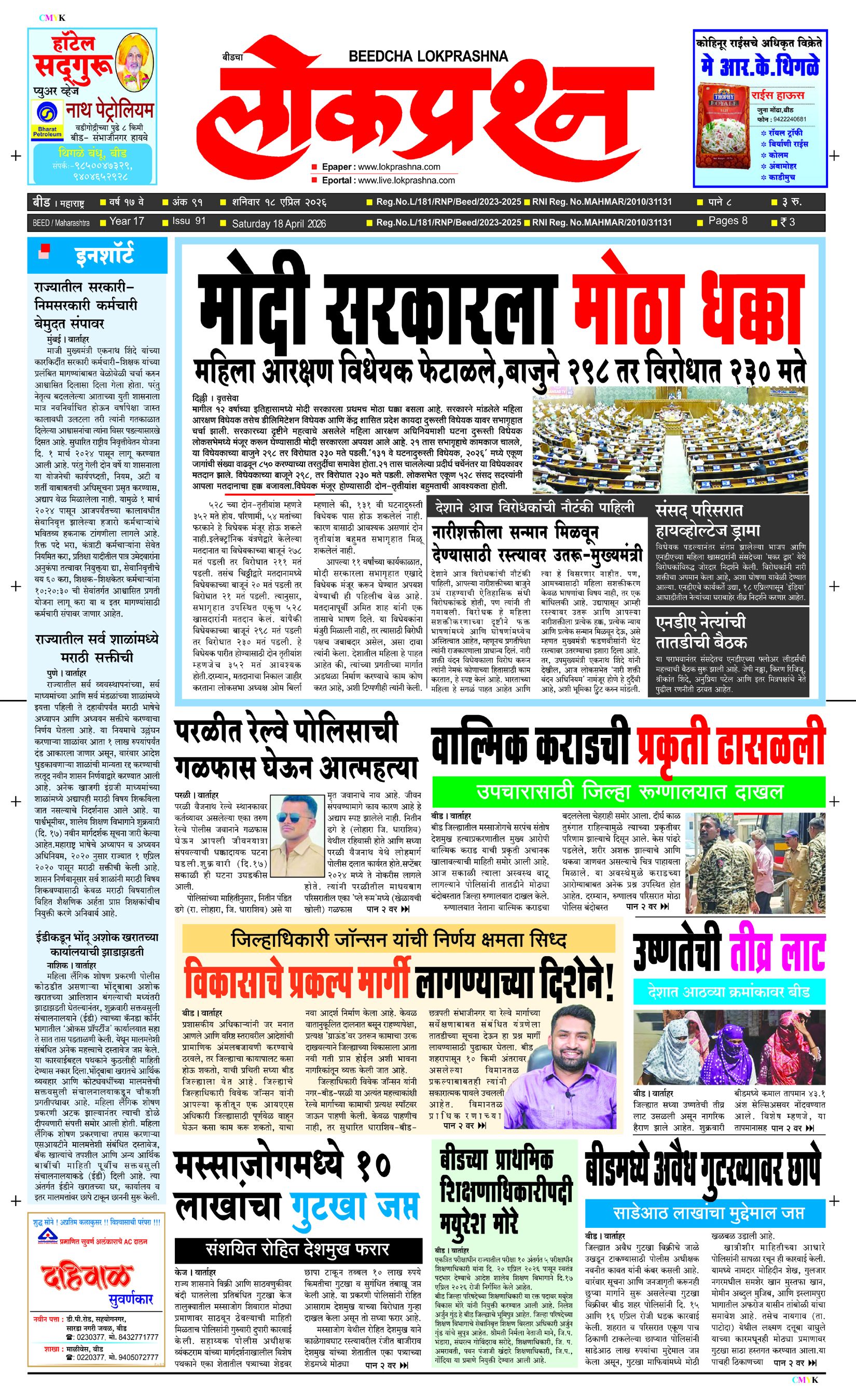 संपादक – दिलीप मधुकर खिस्ती, मो नं 9422242790, जाहिरात विभाग – 9595353531, dainiklokprashna@gmail.com, beedlokprashna@gmail.com, दै. बीडचा लोकप्रश्न, स्टेडियम कॉम्प्लेक्स सहयोगनगर, बीड जि. बीड – ४३११२२ पहिले पान दुसरे पान तिसरे पान चौथे पान पाचवे पान सहावे पान सातवे पान आठवे पान Visitor Counter free online counter Saturday, 18 April 2026