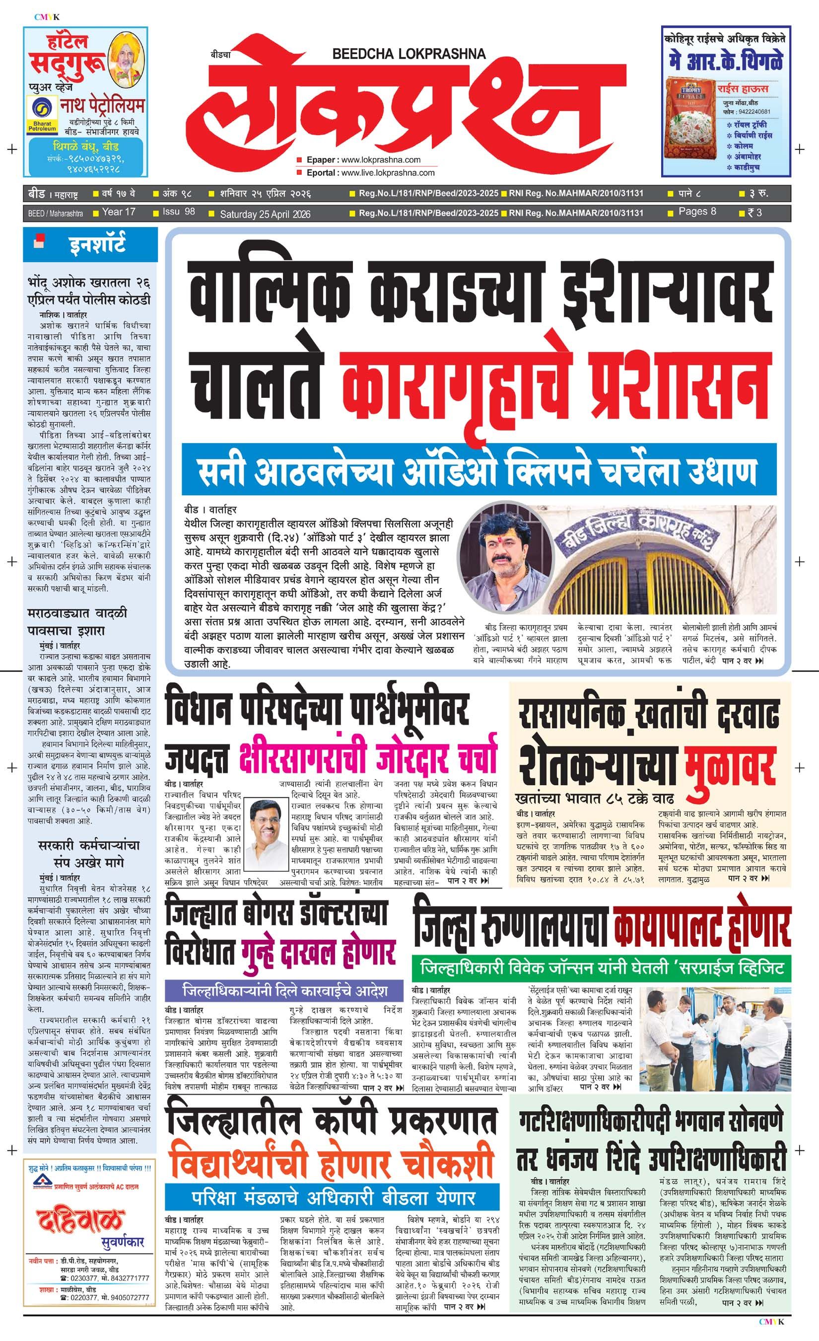 संपादक – दिलीप मधुकर खिस्ती, मो नं 9422242790, जाहिरात विभाग – 9595353531, dainiklokprashna@gmail.com, beedlokprashna@gmail.com, दै. बीडचा लोकप्रश्न, स्टेडियम कॉम्प्लेक्स सहयोगनगर, बीड जि. बीड – ४३११२२ पहिले पान दुसरे पान तिसरे पान चौथे पान पाचवे पान सहावे पान सातवे पान आठवे पान Visitor Counter free online counter Saturday, 25 April 2026
