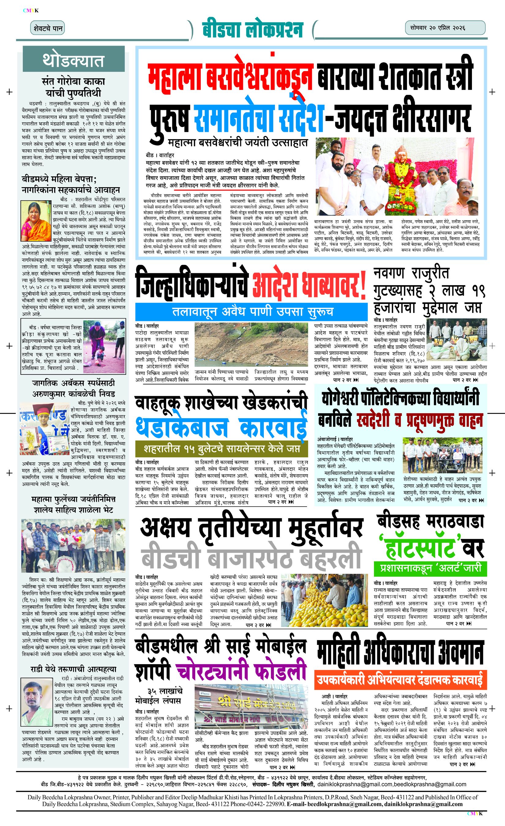 संपादक – दिलीप मधुकर खिस्ती, मो नं 9422242790, जाहिरात विभाग – 9595353531, dainiklokprashna@gmail.com, beedlokprashna@gmail.com, दै. बीडचा लोकप्रश्न, स्टेडियम कॉम्प्लेक्स सहयोगनगर, बीड जि. बीड – ४३११२२ << First << 1 >> Last >> पहिले पान दुसरे पान तिसरे पान चौथे पान पाचवे पान सहावे पान सातवे पान आठवे पान Visitor Counter free online counter