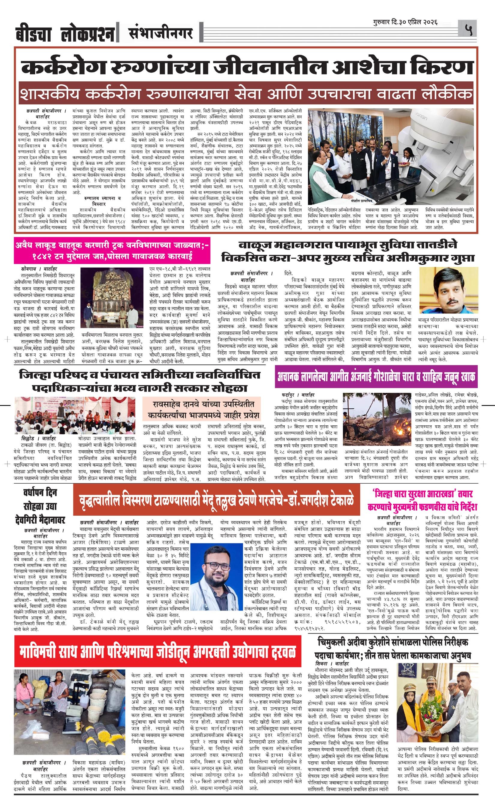 संपादक – दिलीप मधुकर खिस्ती, मो नं 9422242790, जाहिरात विभाग – 9595353531, [email protected], [email protected], दै. बीडचा लोकप्रश्न, स्टेडियम कॉम्प्लेक्स सहयोगनगर, बीड जि. बीड – ४३११२२ पहिले पान दुसरे पान तिसरे पान चौथे पान पाचवे पान सहावे पान सातवे पान आठवे पान Visitor Counter free online counter Wednesday, 29 April 2026
