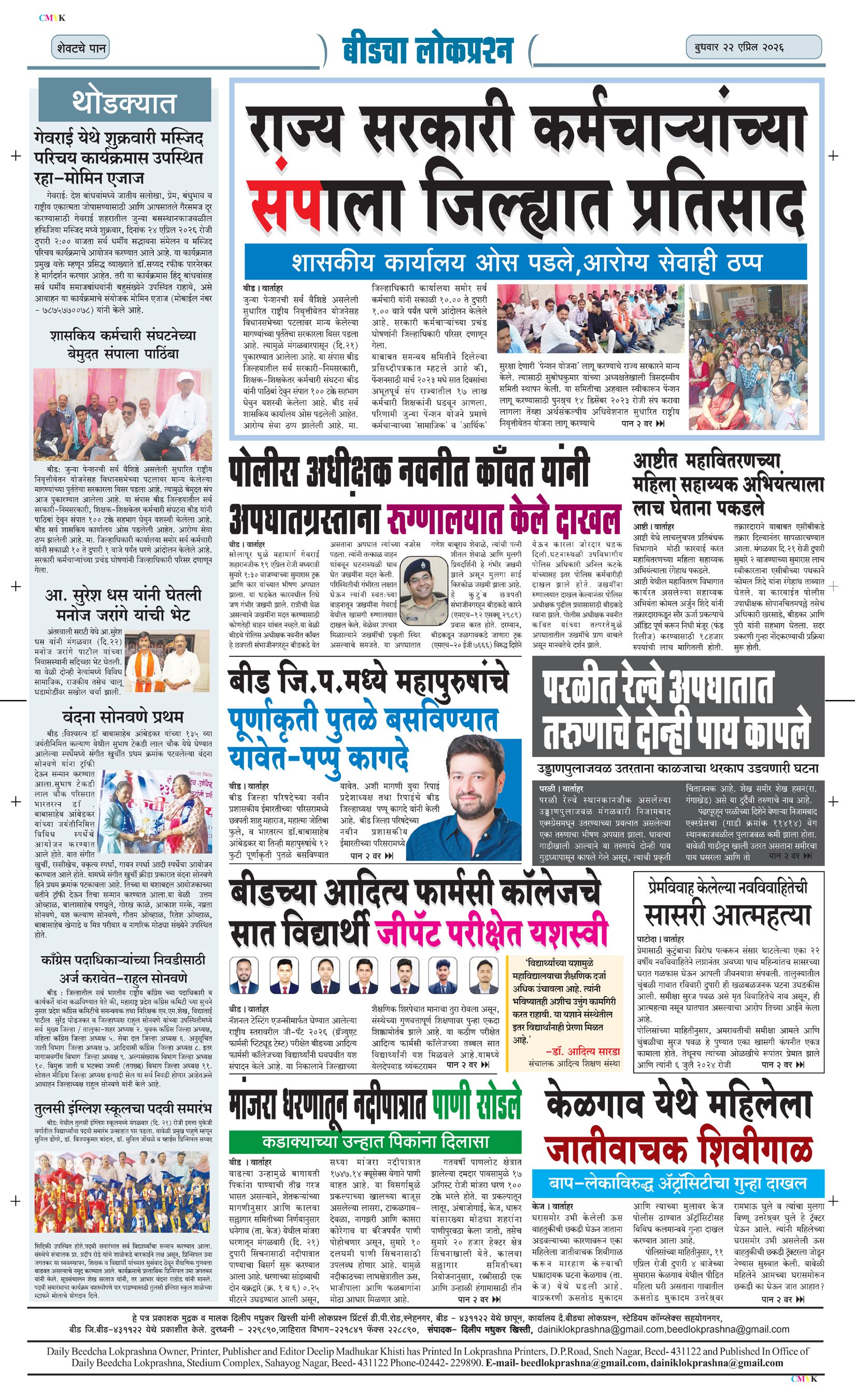 संपादक – दिलीप मधुकर खिस्ती, मो नं 9422242790, जाहिरात विभाग – 9595353531, dainiklokprashna@gmail.com, beedlokprashna@gmail.com, दै. बीडचा लोकप्रश्न, स्टेडियम कॉम्प्लेक्स सहयोगनगर, बीड जि. बीड – ४३११२२ << First << 1 >> Last >> पहिले पान दुसरे पान तिसरे पान चौथे पान पाचवे पान सहावे पान सातवे पान आठवे पान Visitor Counter free online counter